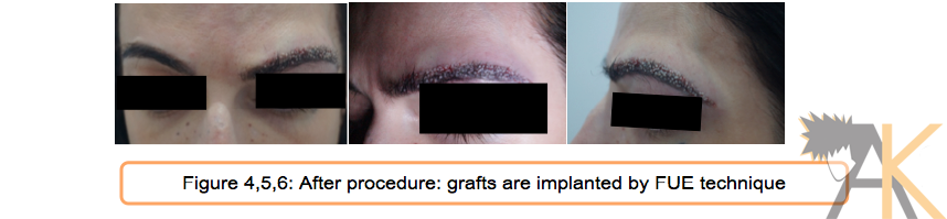 We did a reconstruction of her left eyebrow by Revision -FUE technique. The plan was to transplant around 150 grafts (mainly single follicular units) as some were present already. These were taken from her occipital area. They were implanted by giving coronal slits on the brow. Great precautions were taken to make the slits and implant the hair in the laterally outwards natural direction of the eyebrowand not upwards as earlier. (Figure 4,5,6).The patient was happy as she got thick and full eyebrows.