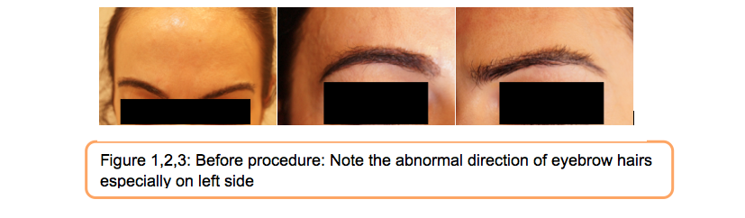 In July 2014, a 30 year old Caucasian female approached us for restoration ofherleft eyebrow. The patient had a history of loss of brow hair initially due to overzealous plucking of eyebrows in her teenage years. Due to resulting thinning of her brows, the patient got a tattoo on the brow to try and mask the lack of hair, but was unhappy with the resulting look. This led to her decision to undertake a brow transplant in September 2013.She underwent restoration of both eyebrows by FUE technique but had no idea regarding the number of grafts transplanted. The end result was not satisfactory with abnormal directionofhairs especially over her left eyebrow (Figure 1,2,3).